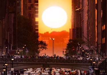 Manhattanhenge is a unique event where the setting sun aligns perfectly with Manhattan's street grid, creating a breathtaking spectacle of light and architecture in NY City.